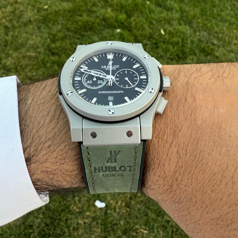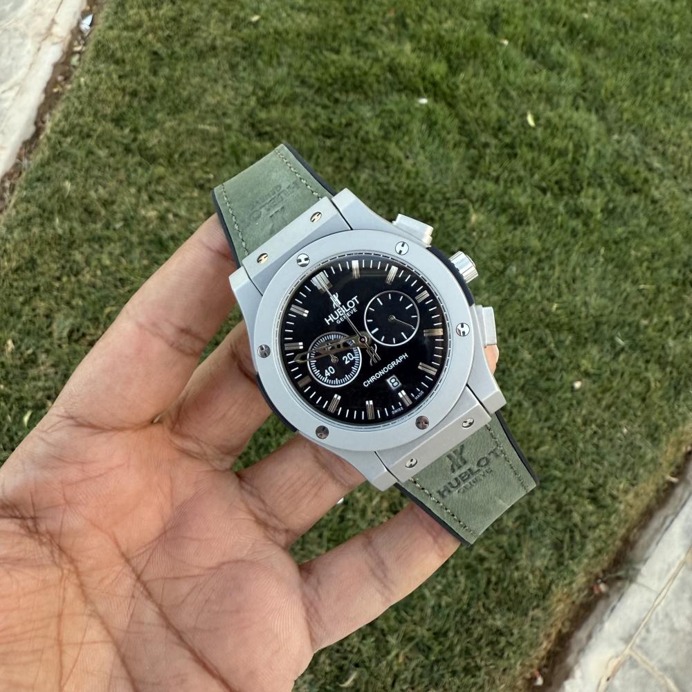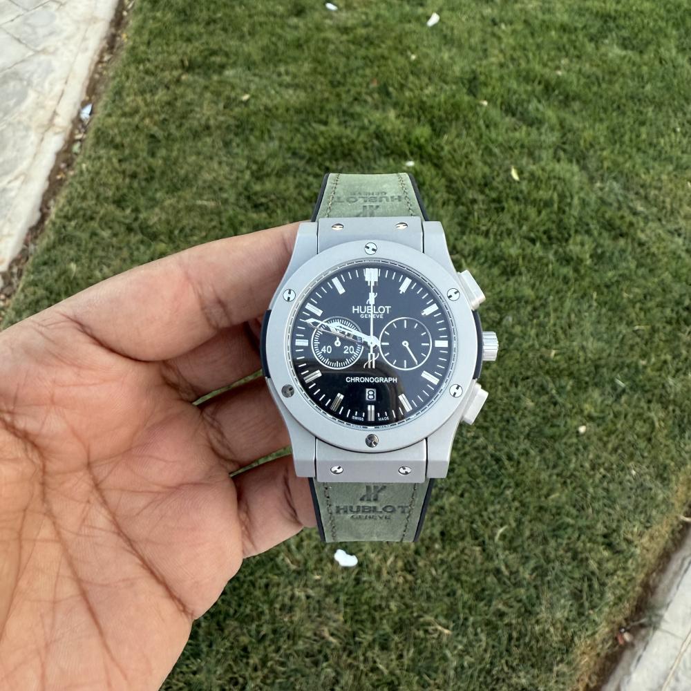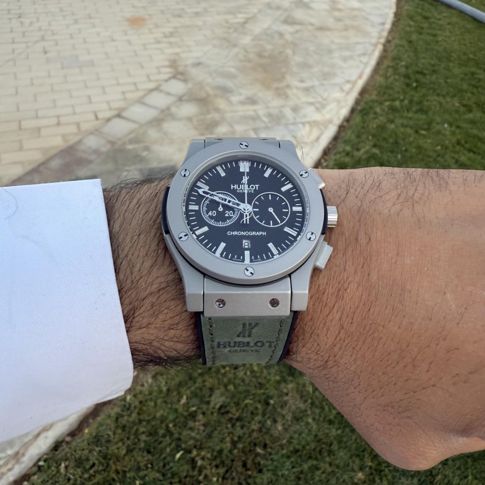 Hublot bag bangساعة اوبلو كلاسكربر الساعه من الشمواه الاخضرتصوير شخصيمقاس القطر 42MMماكينة الساعه تعمل بطاريه ستوب ووتشطبق اصلتصوير شخصي
